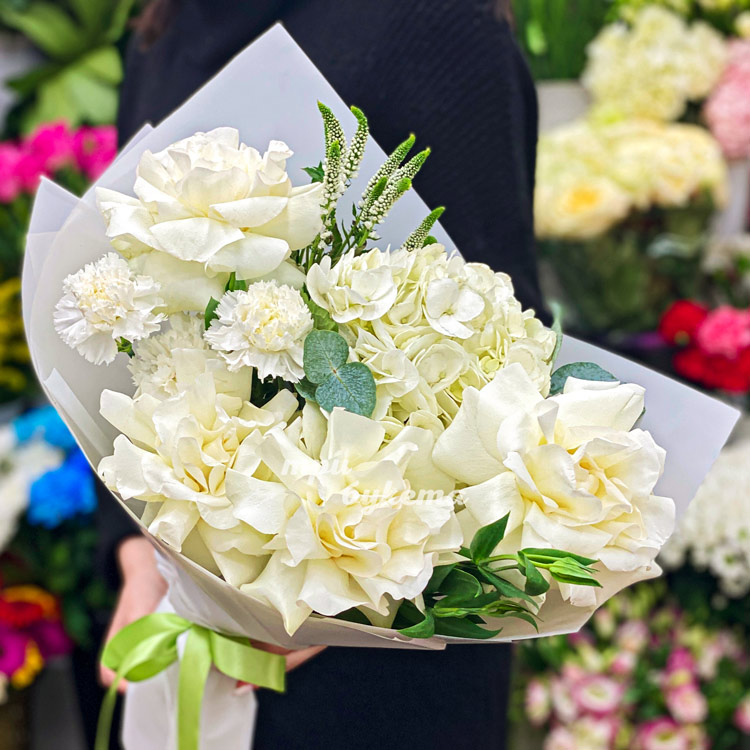 Белый букет роз, гвоздик и гортензии