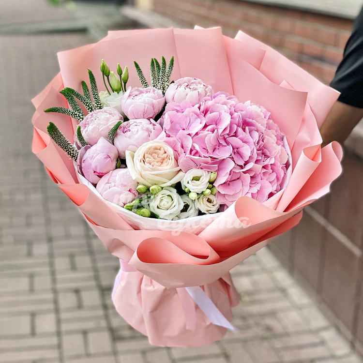 Букет из розовой гортензии и пионов