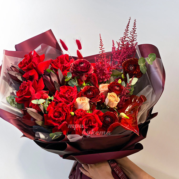 Букет красных ранункулюсов, роз и зелени