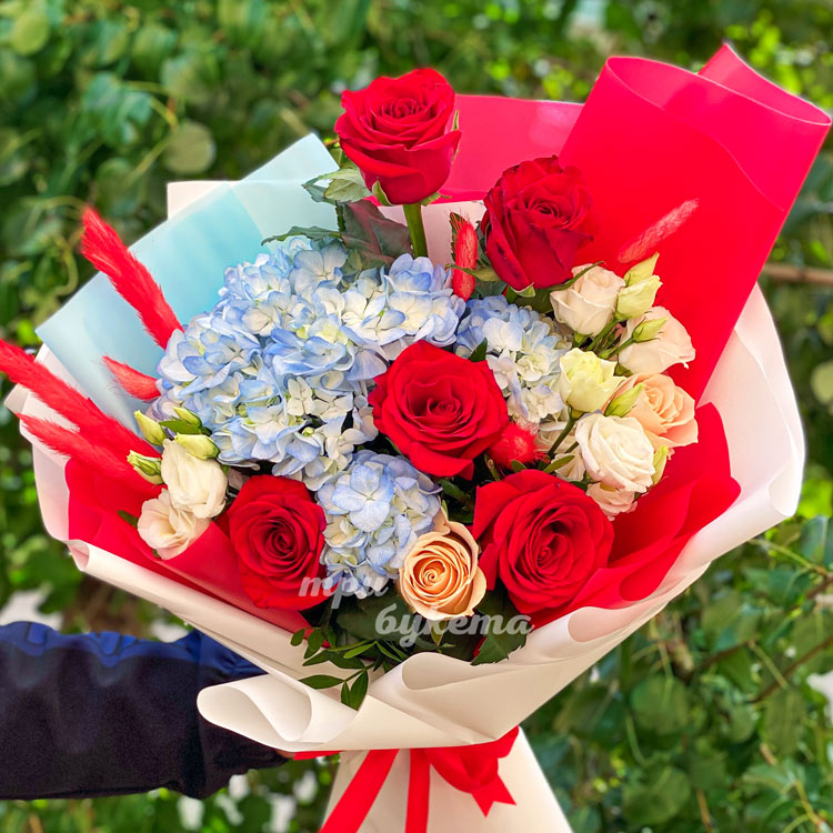 Букет красных роз и синей гортензии