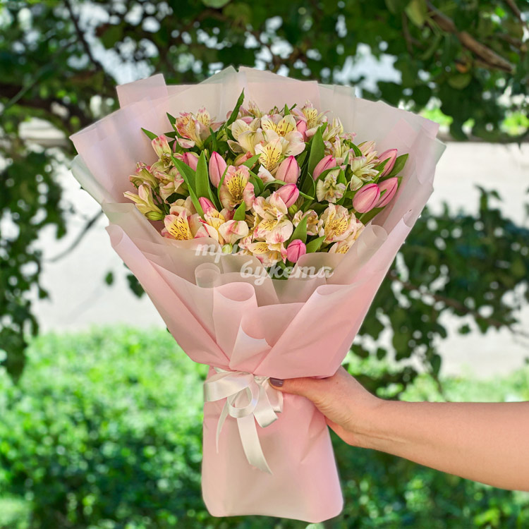 Букет розовых тюльпанов и альстромерий