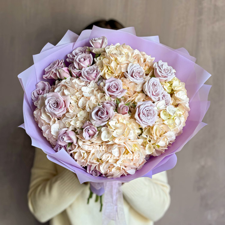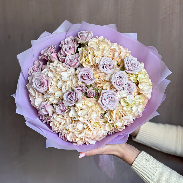 Букет сиреневых роз и кремовых гортензий