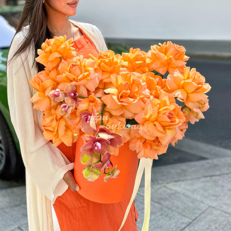 Коробка оранжевых роз с орхидеями