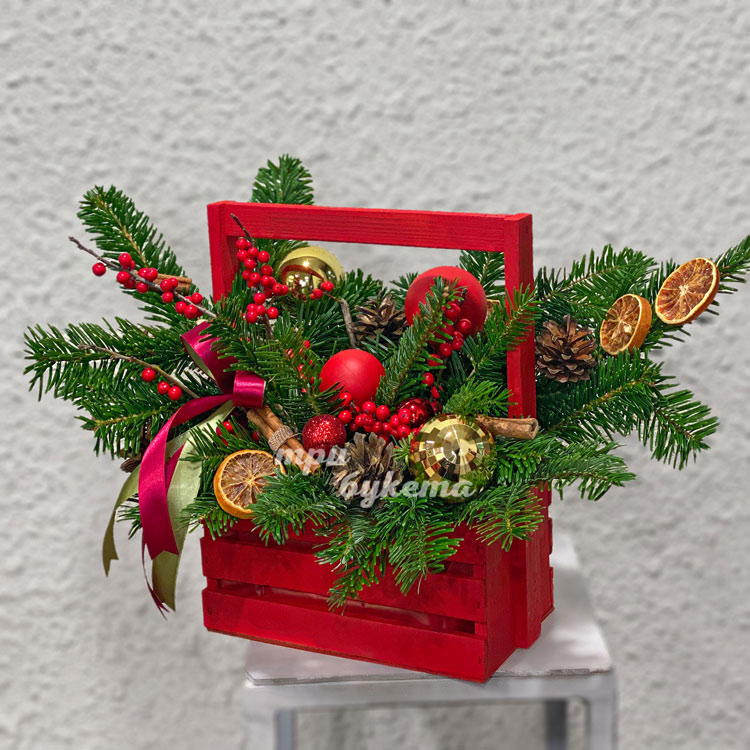 Красный новогодний ящик с хвоей и декором
