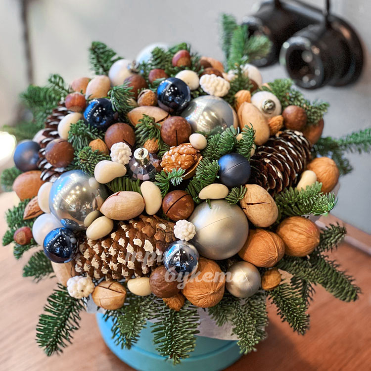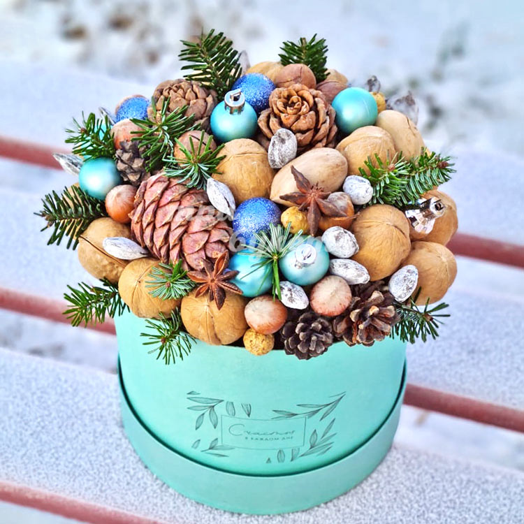 Орешки и шары в новогодней коробке