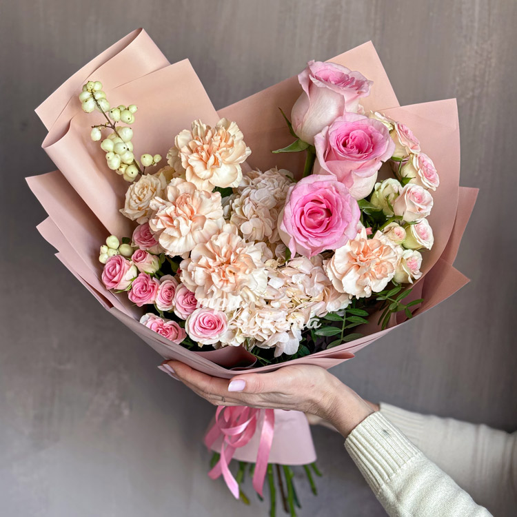 Розовые розы и персиковые диантусы в букете