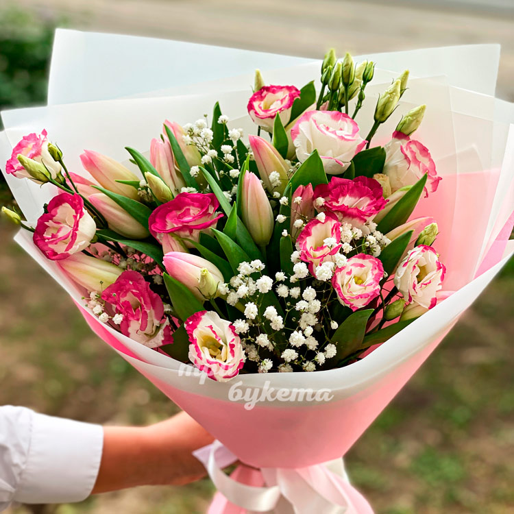 Розовый букет из тюльпанов и эустом