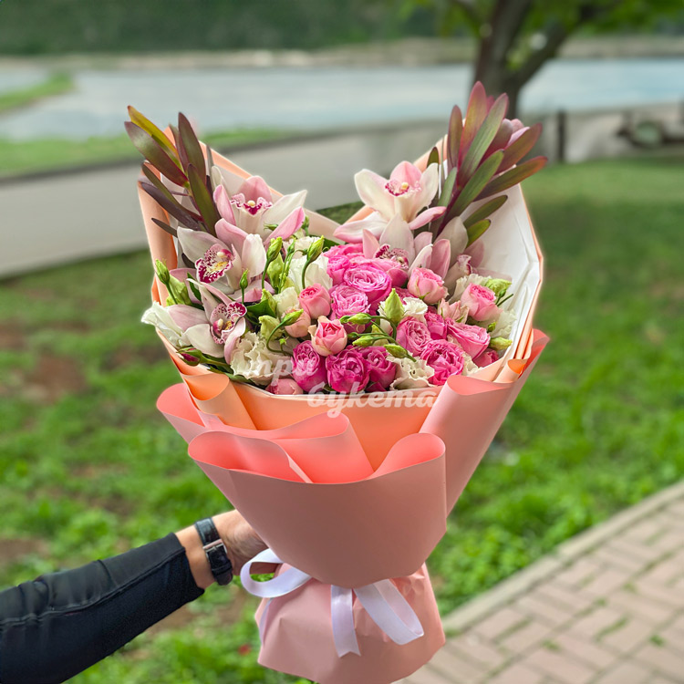 Розовый букет орхидей и пионовидных роз