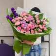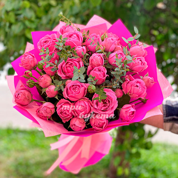 Розовый букет пионовидных роз с эвкалиптом